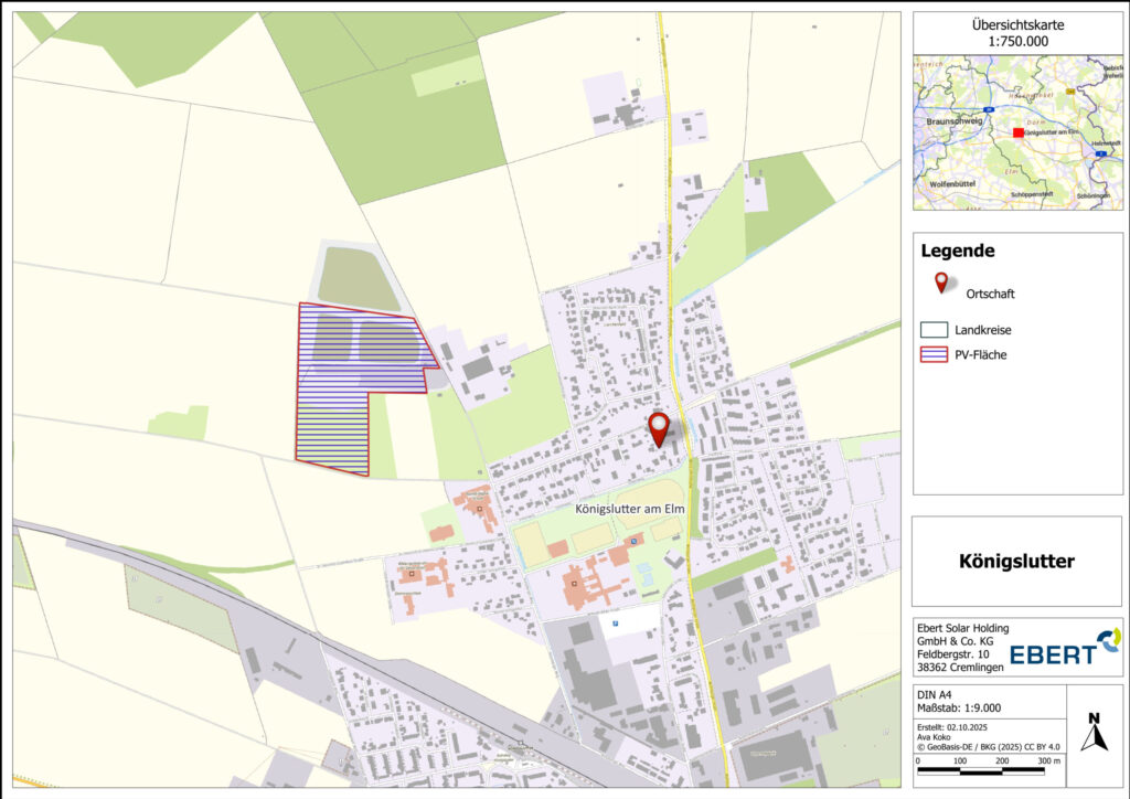 Diese Woche hat der Bau des Solarparks in Königslutter am Elm begonnen. Auf einer ehemaligen Konversionsfläche entsteht eine Photovoltaikanlage mit einer installierten Leistung von ca. 6.000 kWp, die künftig rund 7,5 GWh Strom pro Jahr erzeugen wird – genug, um bis zu knapp 3.500 Haushalte zu versorgen. Durch die Anlage werden jährlich ca. 4.830 t CO₂ vermieden (144.900 t CO₂ über 30 Jahre).
